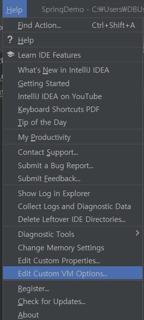 위에 있는 상단바에 Help를 누르고 Edit Custom Vm Options을 클릭하면 파일이 하나 뜬다