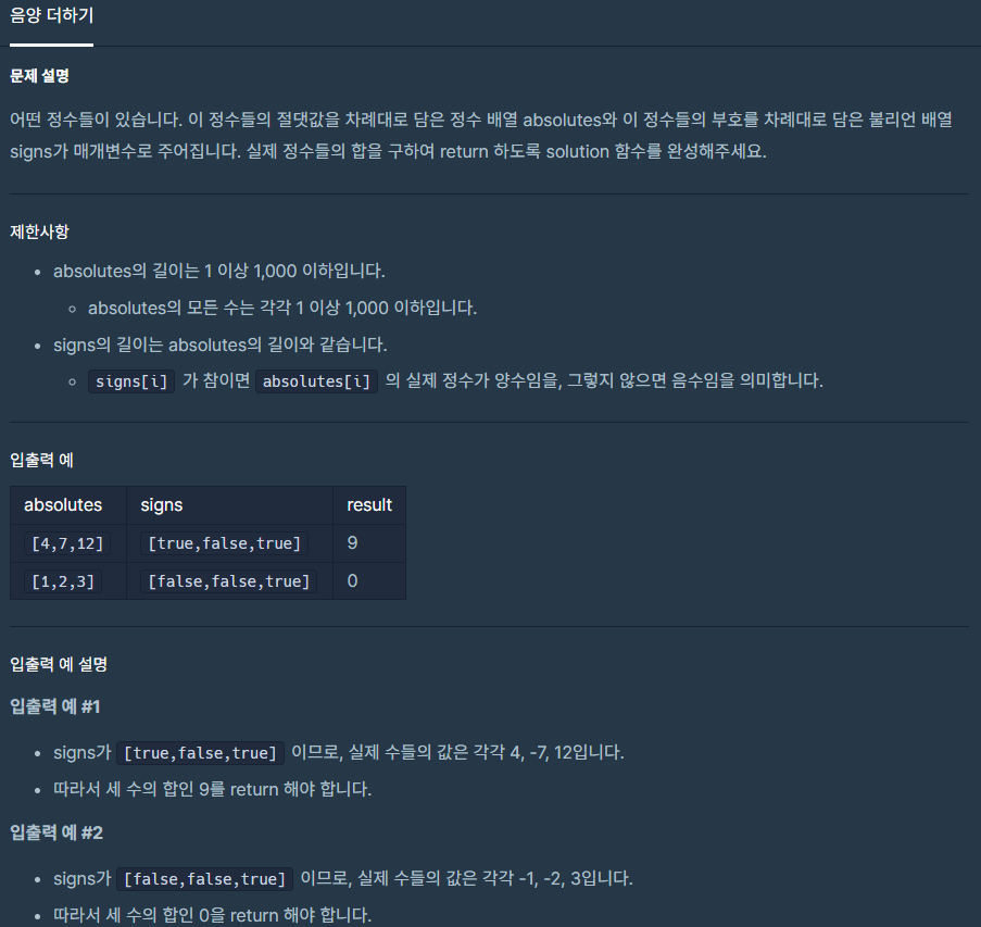 [프로그래머스 Lv1] 75061번 : 음양 더하기 - JAVA [자바]